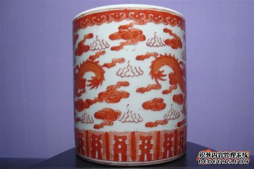 宝物:清代同一时期,石榴香蕉叶涂有红色和珐琅的笔筒。笔筒的嘴和直径为7。