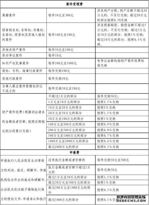 1.结婚,每件价格为50-300元,超过20万的,加收0.5%二,侵权行为:10万元以上,50%以上,300元以下,5万元以上,10万元以上,1%,0.5%。第三,在其他与财产无关的案件中,每件为50元至100元;在发生劳动争议时,为每件10元。5,知识产权纠纷,每起案件为500-1000元,如有纠纷数额,将按收案标准处理。6.根据破产案,破产财产的总金额将按照财产案件索赔标准的一半支付,但最高不得超过30万元7。对于商标,专利和海事管理,每件收费100元,对于其他类型的行政案件,每件收费50元。9.如果包括管辖权,但未确定相关争议,则每件收费50-100元。收费标准分别是1万元,50元,1万至10万元,不足2.5%。减200元,100,000至200,000、2%,加300元,20、10,000至500,000、1.5%加1300元,500,000至100万,1%加3,800元,100万至200万。加上4,800美元,从200万到500万美元收取0.8%的费用,再加上6,800美元,从500万到1000万美元从0.7%收取的费用,再加上101,000元人民币。1000万至2000万收费和21800元的0.6%,2000万收费和41000元的0.5%。11,案件执行费,未执行的将收取50元至100元。执行金额为每张10,000元人民币或以下。执行金额从1万元到50万元以上,手续费为1/5减100元。100,000至500万以上,加1%加2400元。500万到1000万,零利率5加2700元。1000万元以上,加0.1%,67.4万元。12,如果保护费,财产的保护费不超过1000元,或者与保护费无关,则每件加收50元。1000元至100,000元的部分收取1%的费用。超过10万元的,按0.5%收取,但大部分不超过5,000元。支付订单请求XIII将按照房地产案件费用的1/3支付。十四,通知请求书,每起案件支付100元;仲裁裁决被撤销或者裁定仲裁协议有效的,每起案件支付400元。