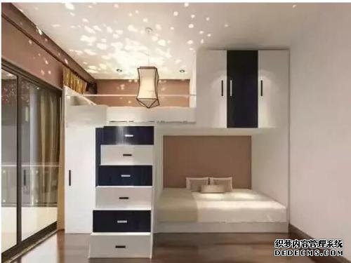 学习桌的侧壁是一排嵌入式展示架。垫子的一侧有一排厚厚的白色橱柜,实用物品可以放在床旁的小桌子上。