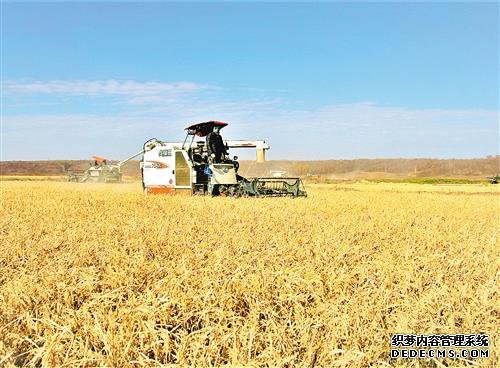 10月9日,来自黑龙江省北安市的一位农民在田间干活。目前,黑龙江寒冷地区的水稻收成的黄金季节到处都是金色的稻田。